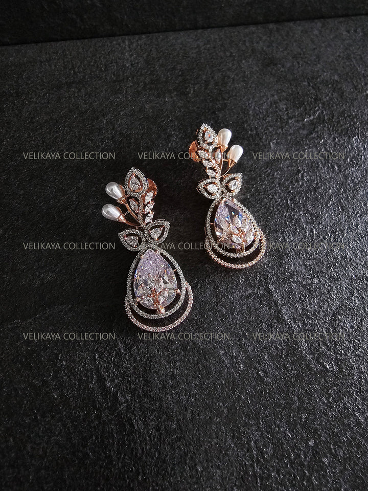 Elegant long earrings with floral motif and large statement tear-drop centre stone. Created with luxurious cubic zirconia set in a metal setting with beautiful rose gold finish.