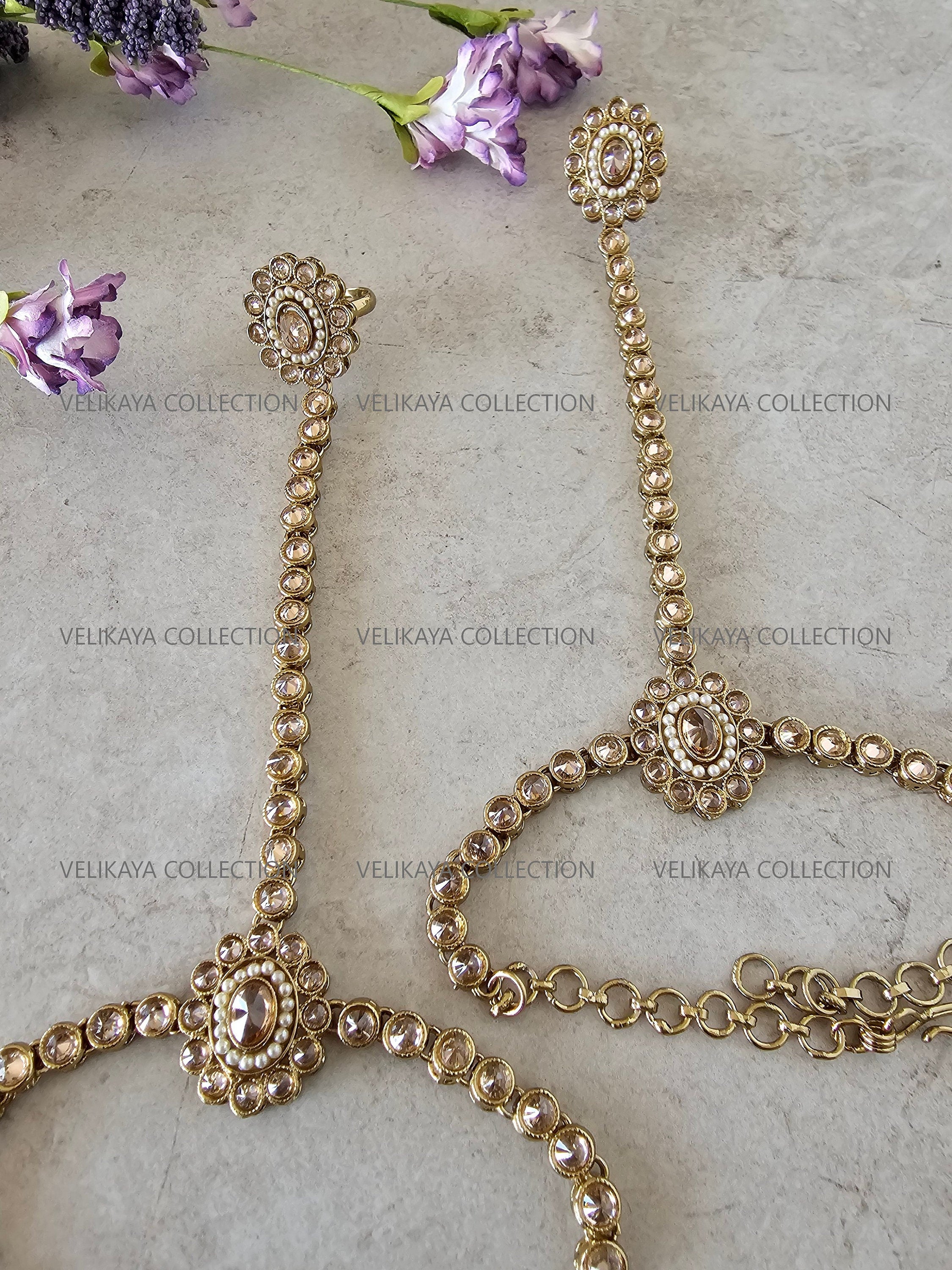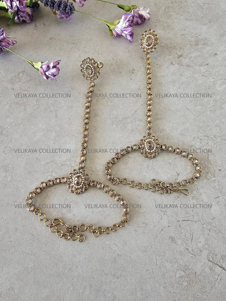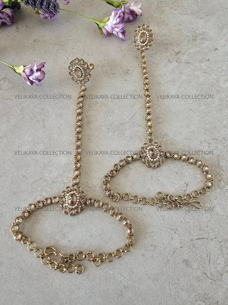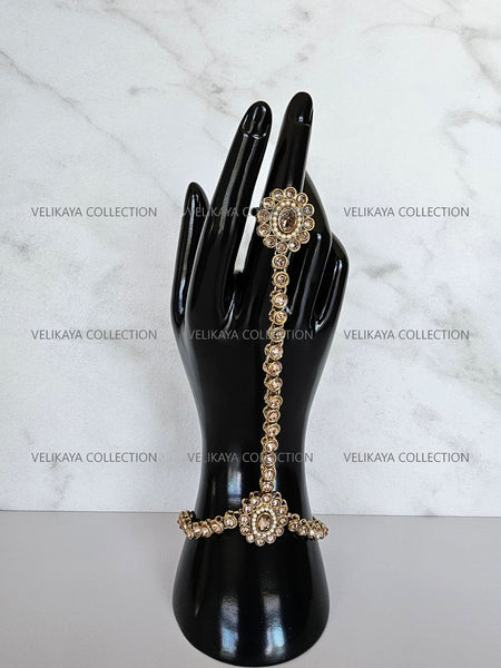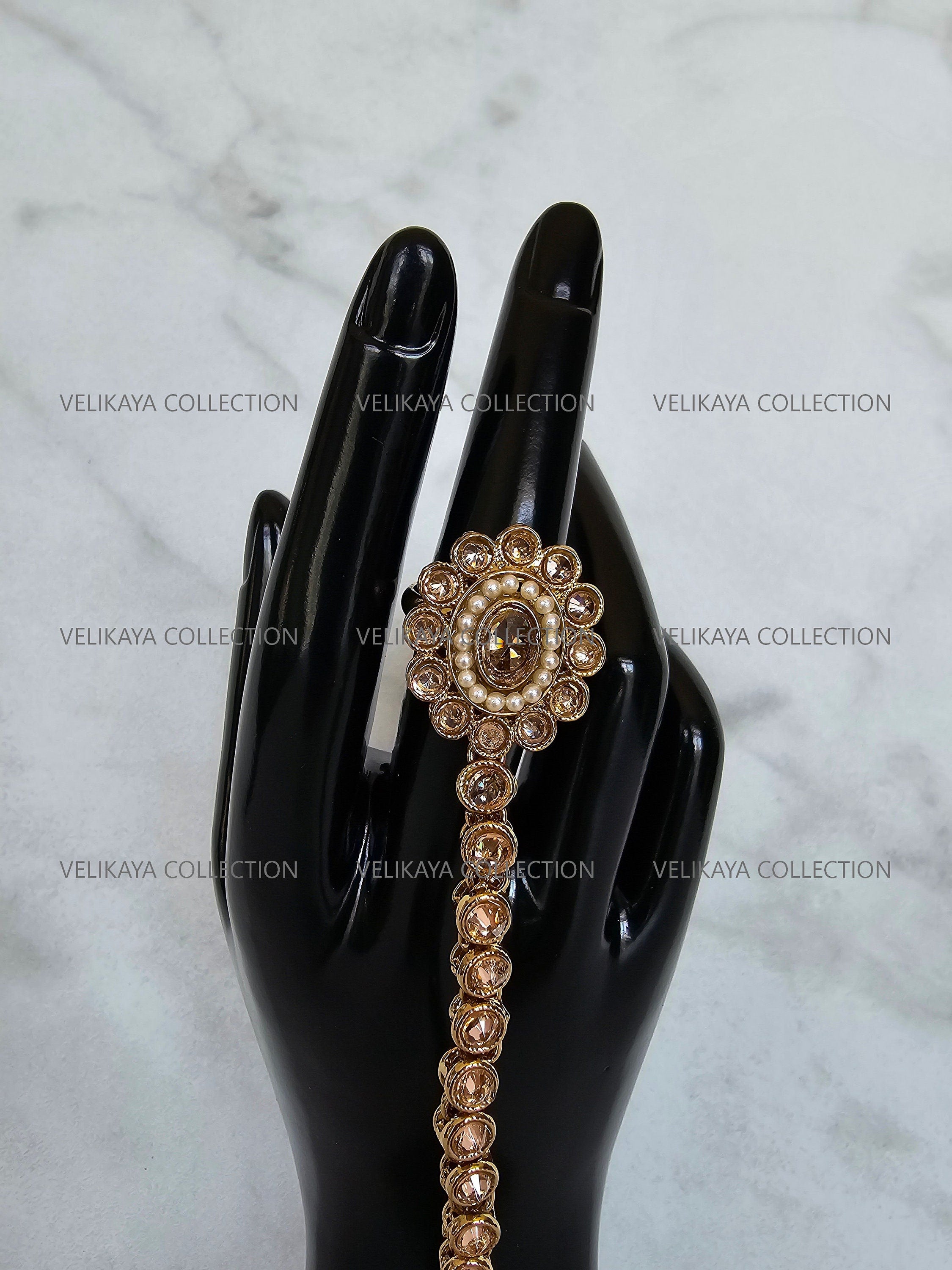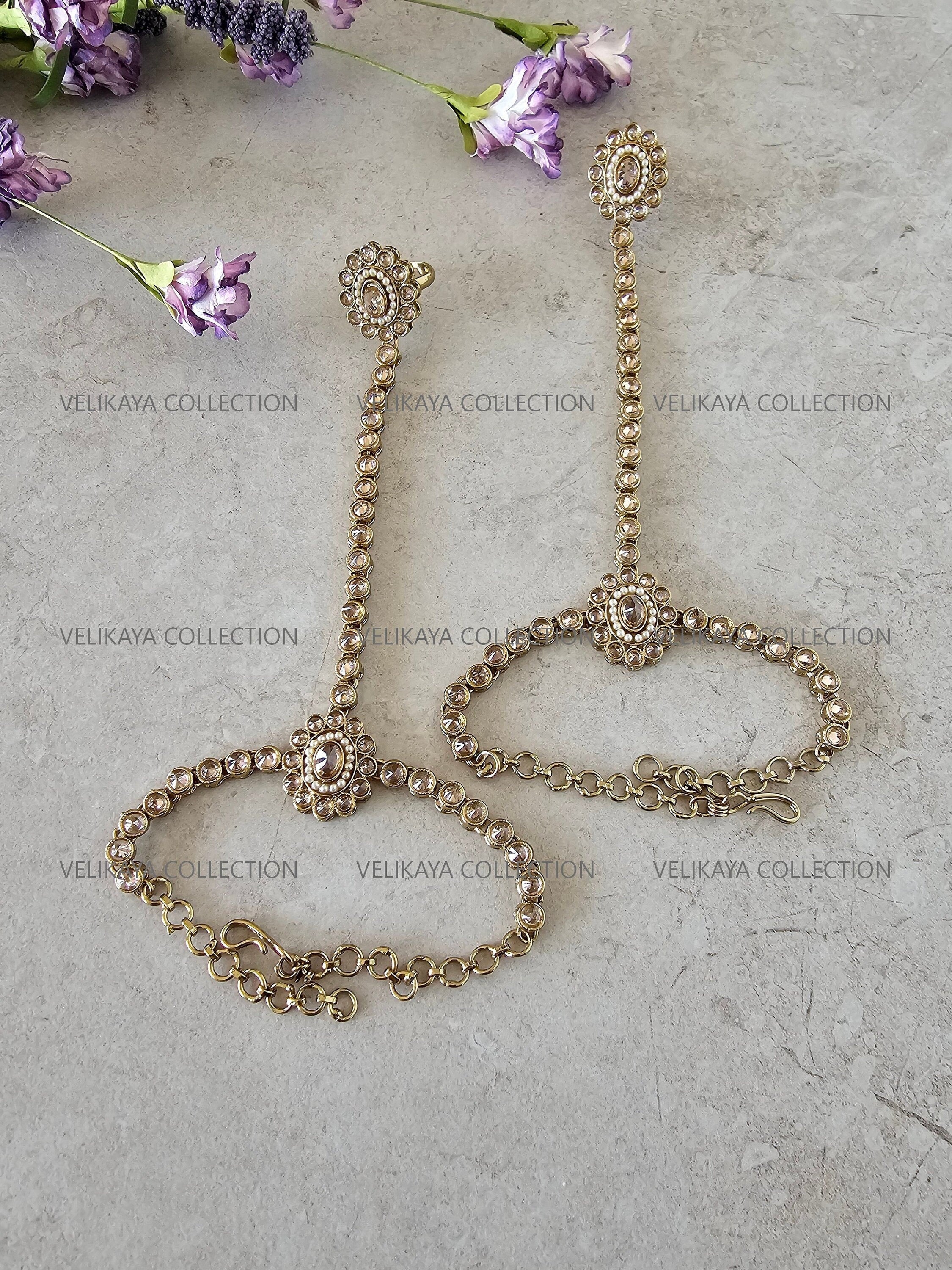 Pair of elegant hathphool / hath panja / hand harness with adjustable ring. Made with high quality champagne stones and antique gold plating.