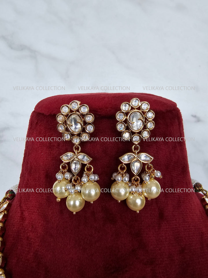 Premium Gold Plated Kundan Necklace Set with beautiful flower motif kundan stud earrings. Adorned with elegant faux pearls. Stones firmly set in silver foil. Not glued.