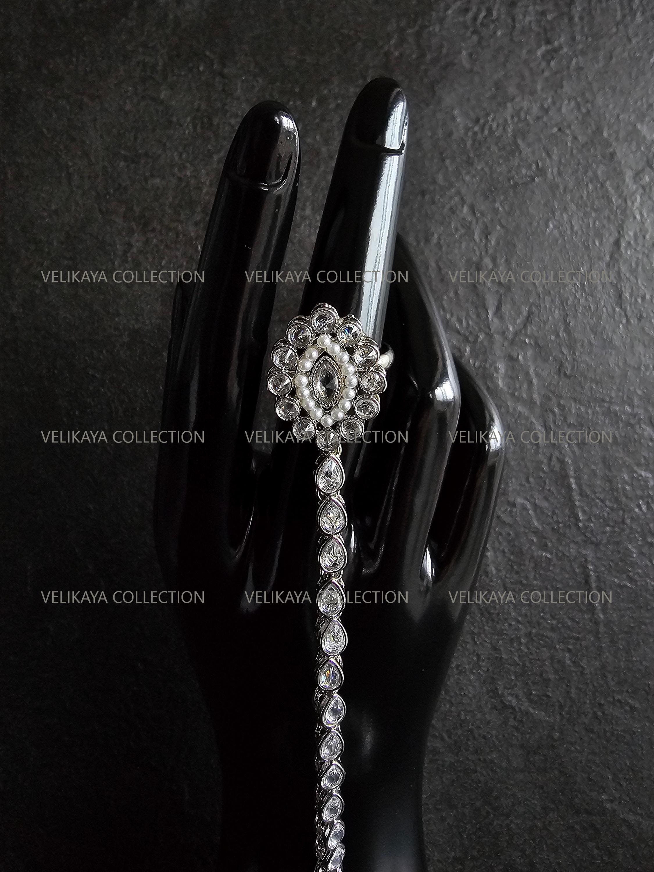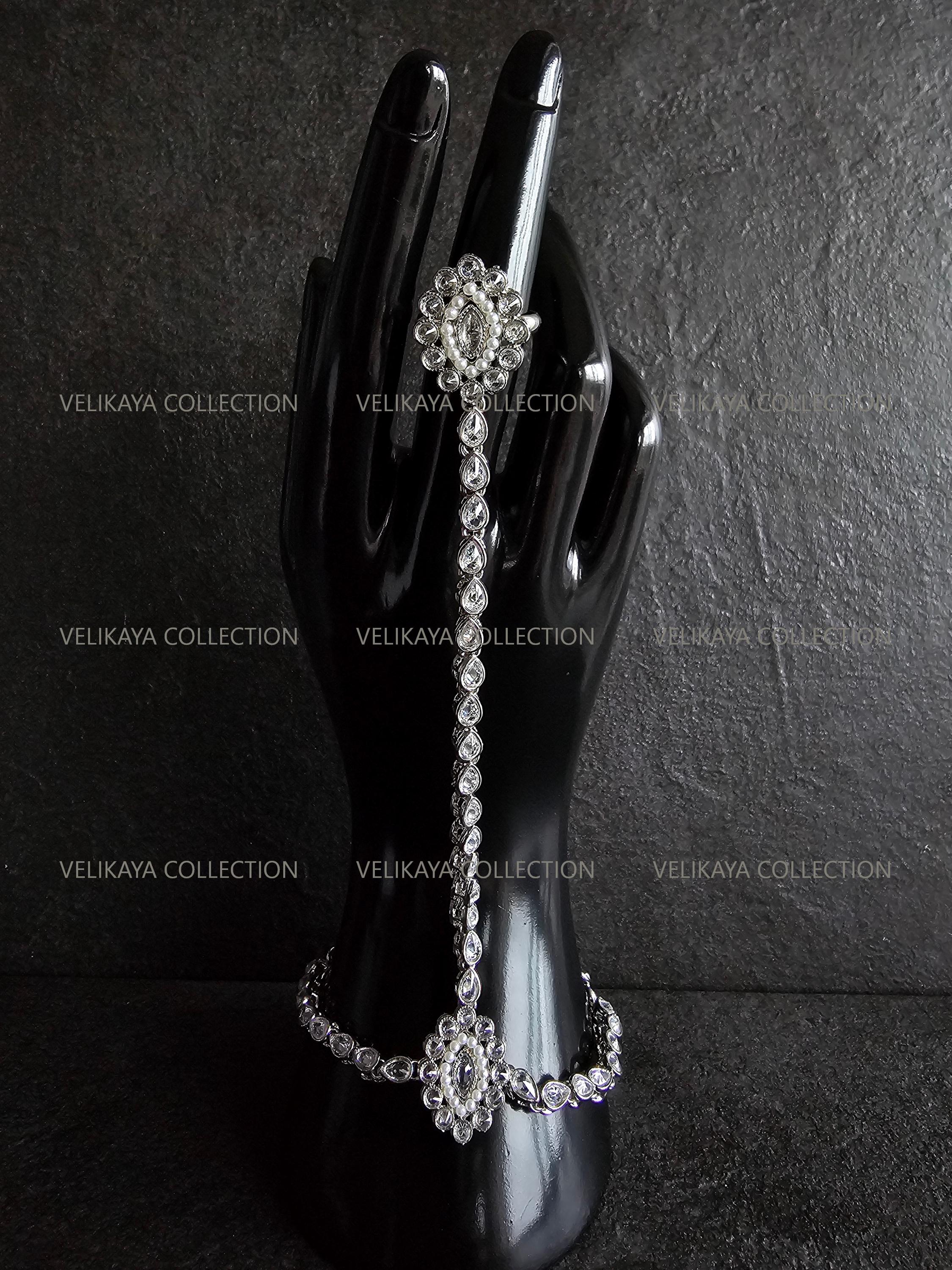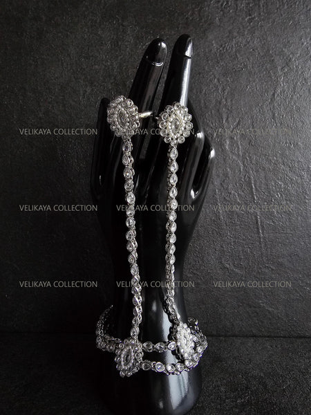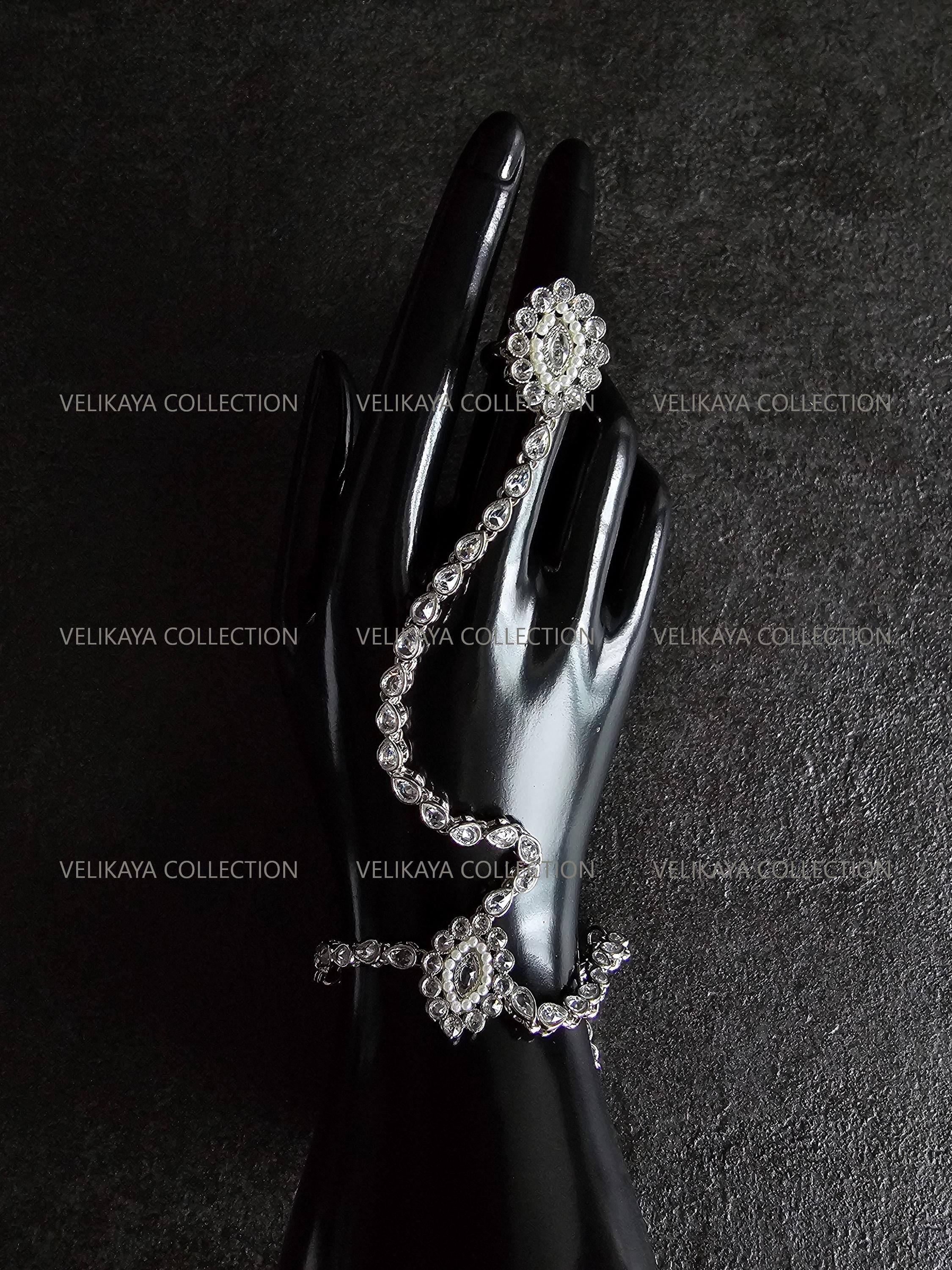 Pair of elegant hathphool / hath panja / hand harness with adjustable ring. Made with high quality clear white stones and silver plating.