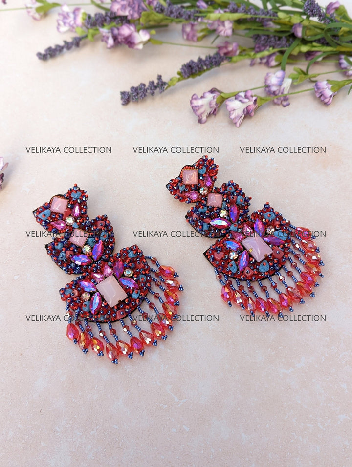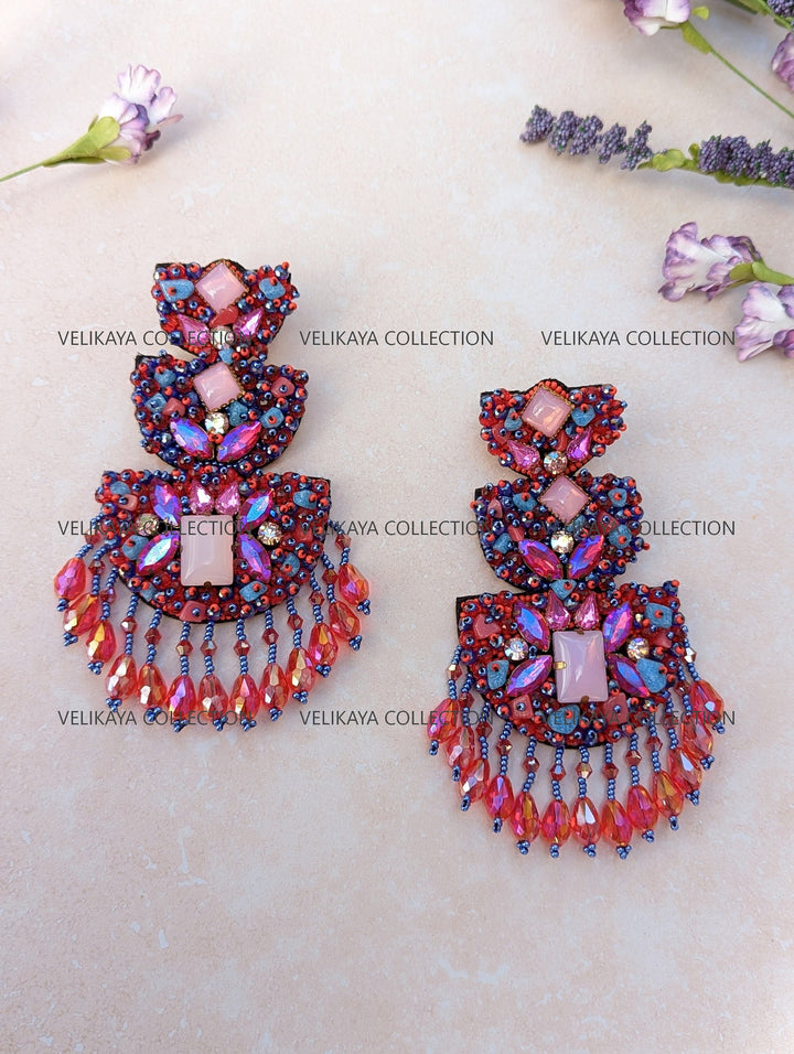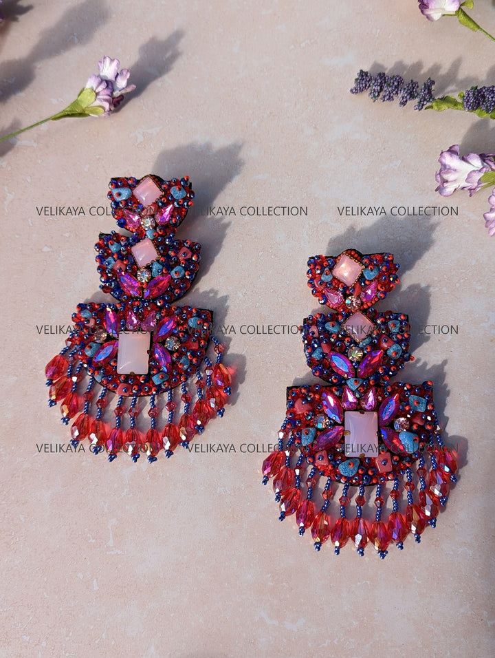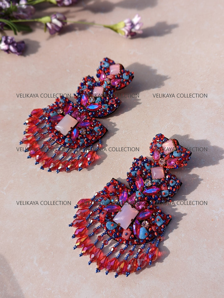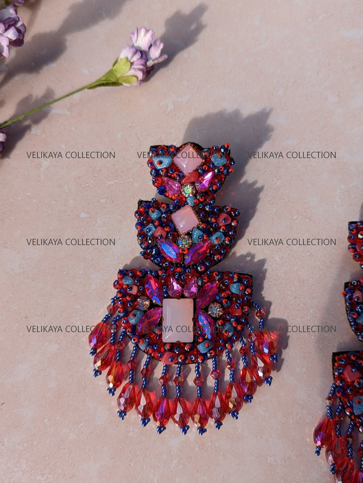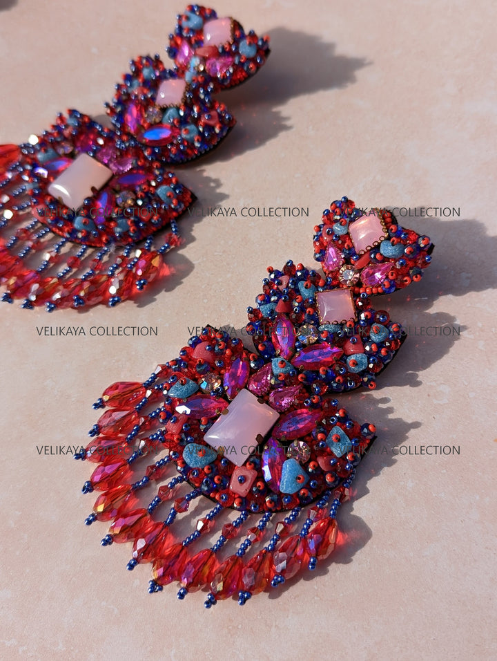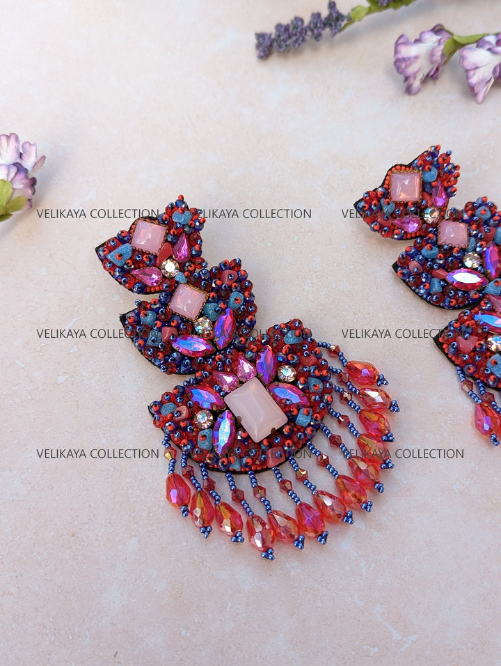 Premium party wear earrings made with imported Japanese beads and crystals in the front. Natural fabric in the back. Meticulously handmade by Indian artisans.
