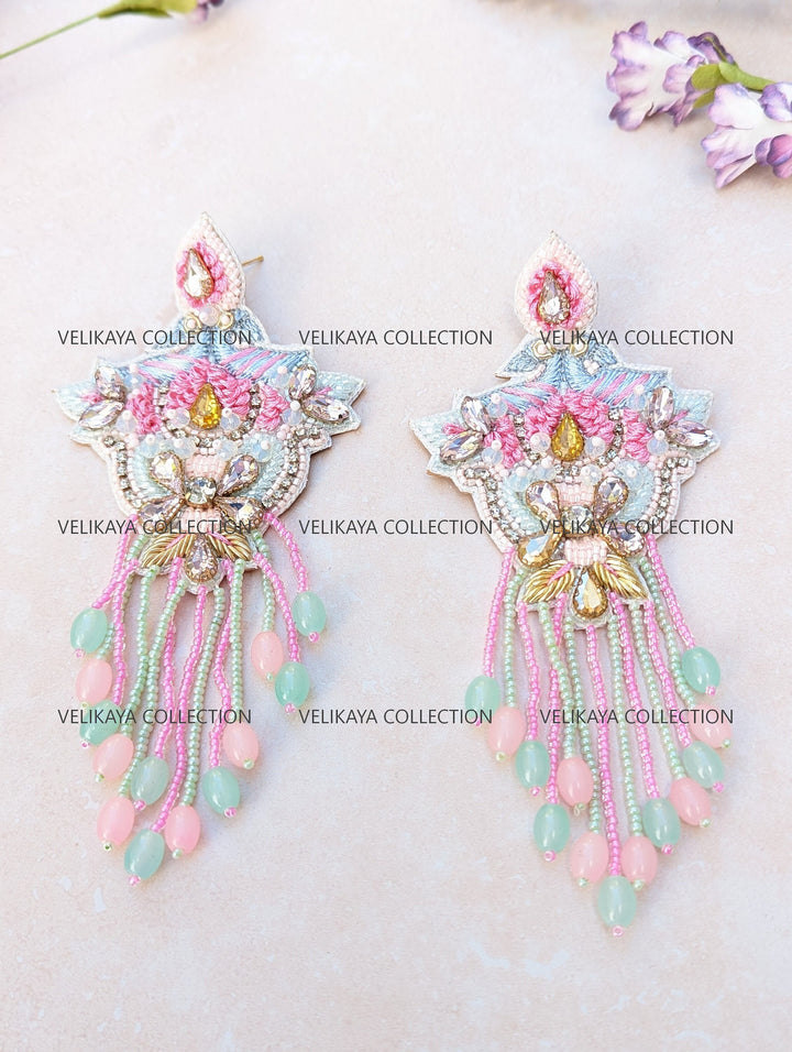 A modern take on traditional Zardozi work. These unique earrings are light weight and dangle beautifully. This is the hot new trend in wedding jewelry. Wear these for mehendi event or a spring summer wedding.