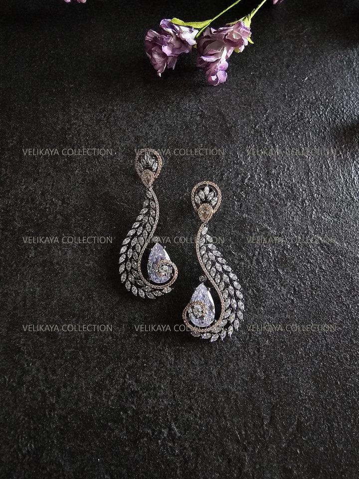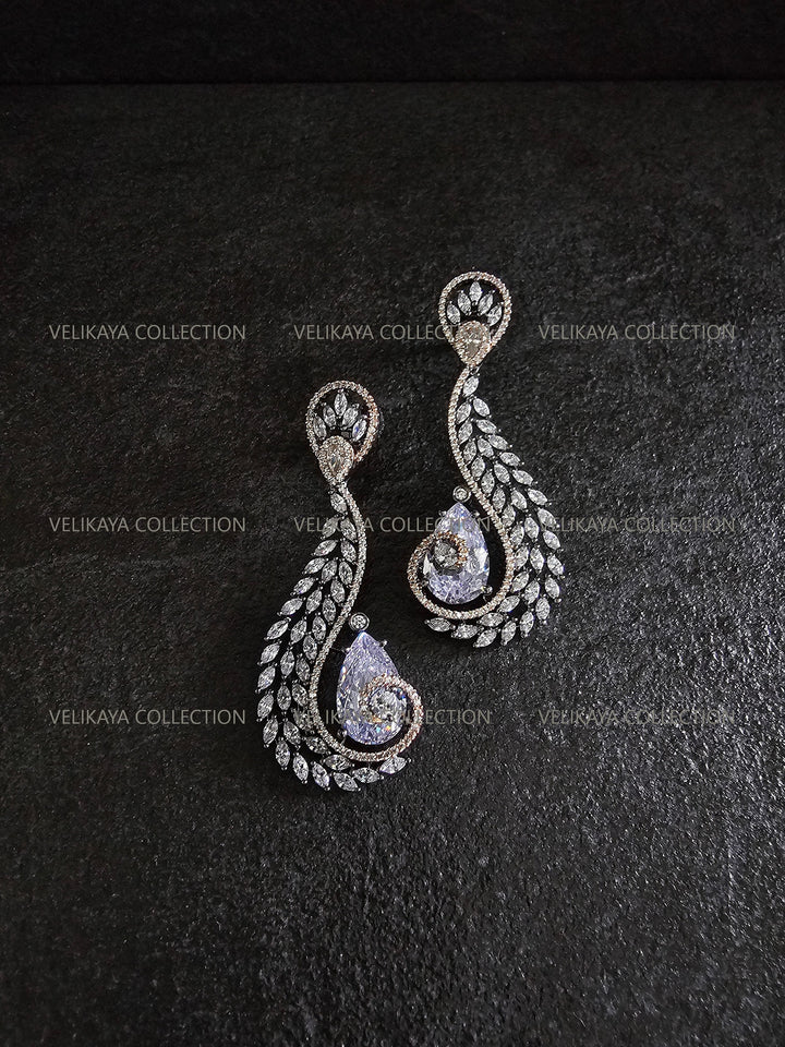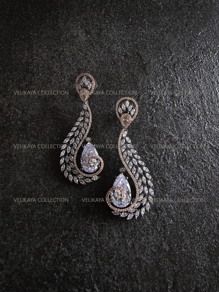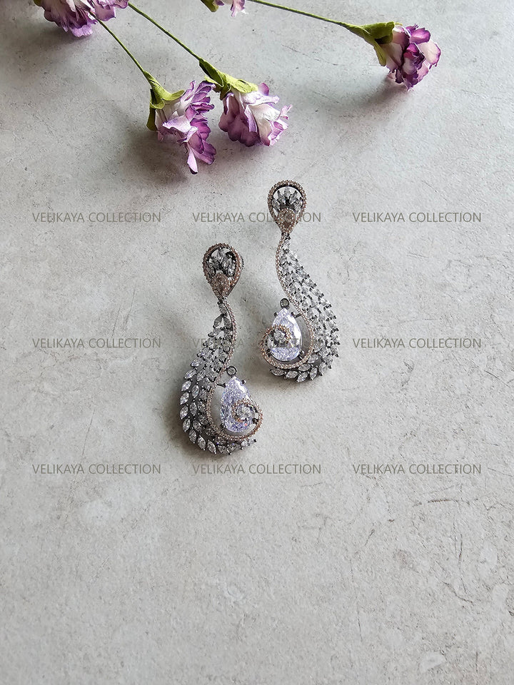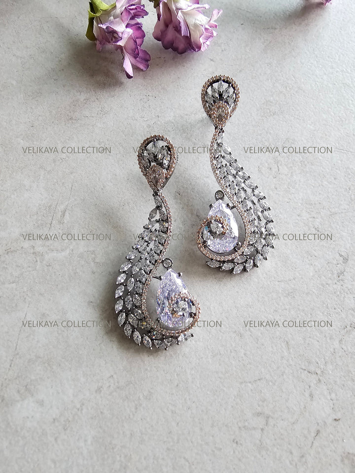 Elegant party wear earrings with beautiful tear drop zircon stones in the middle. Made with highest quality CZ stones and expert craftsmanship. Ideal for weddings and holiday season parties.