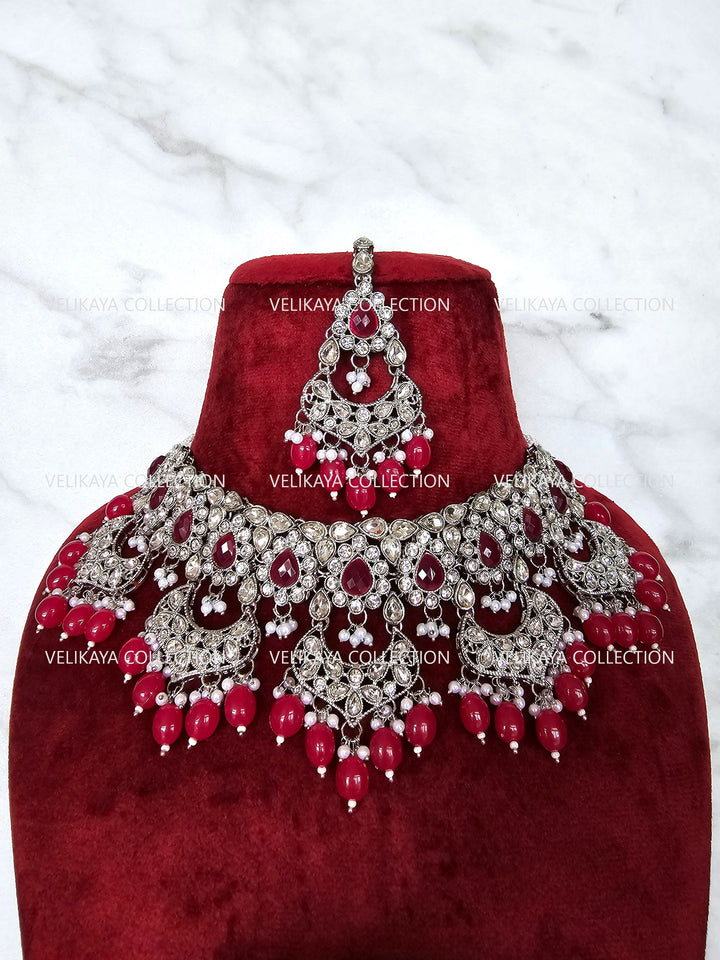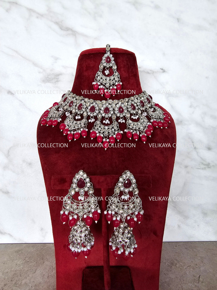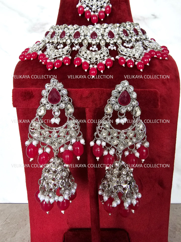 Tanu Silver Polki Choker Necklace with Jhumka Tikka - Red