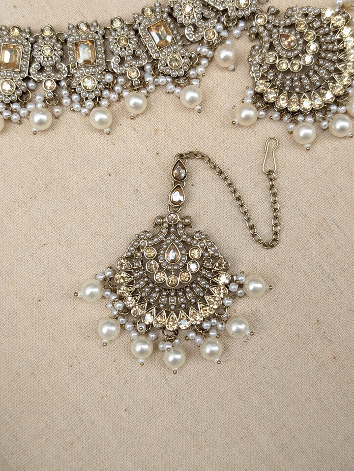 Victorian style polki choker necklace with antique gold plating, champagne stones and white pearls (faux). Paired with beautiful statement jhumkas with ear chains or sahare and tikka.