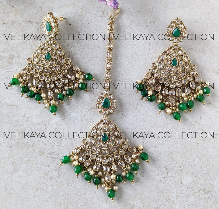 Zoya Green Antique Gold Plated Polki Earrings & Tikka