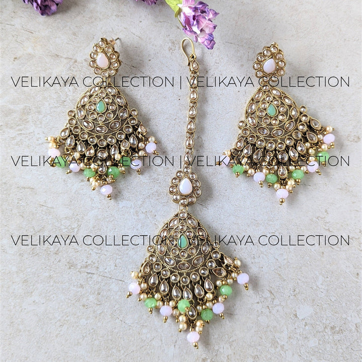 Zoya Mint Antique Gold Plated Polki Earrings & Tikka