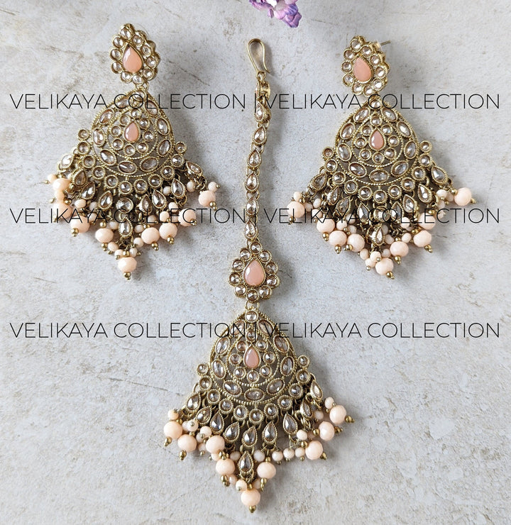 Zoya Peach Antique Gold Plated Polki Earrings & Tikka